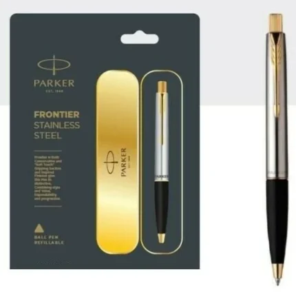 This authentic Parker pen set features a sophisticated red body enhanced with elegant gold-tone accents.